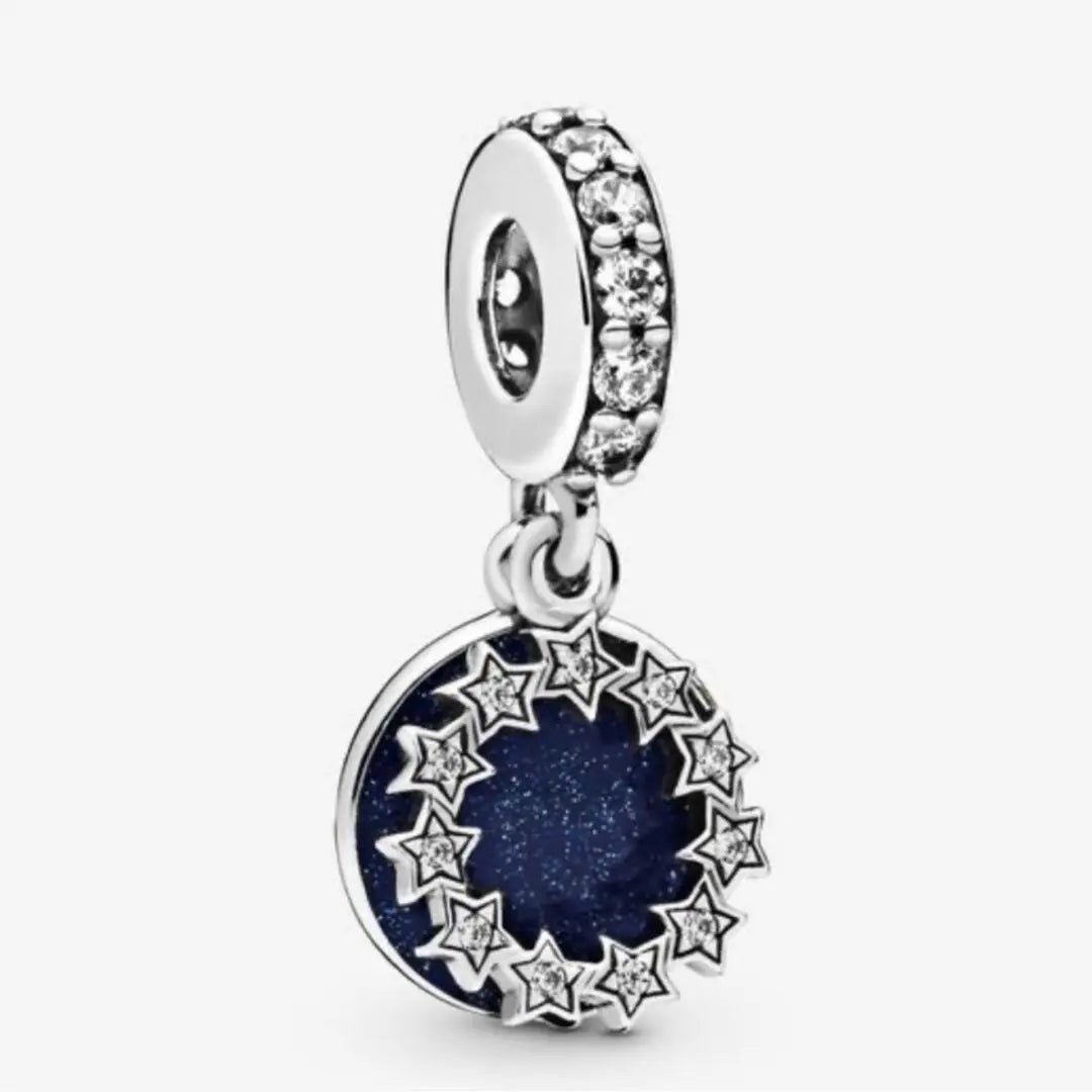Pandora Inspirational Stars is a silver Dangle with a circle of stars studded with clear cz and it lays on a dark blue enamel circle. Engraving is Dream it, Wish it, Do it. 798433c01