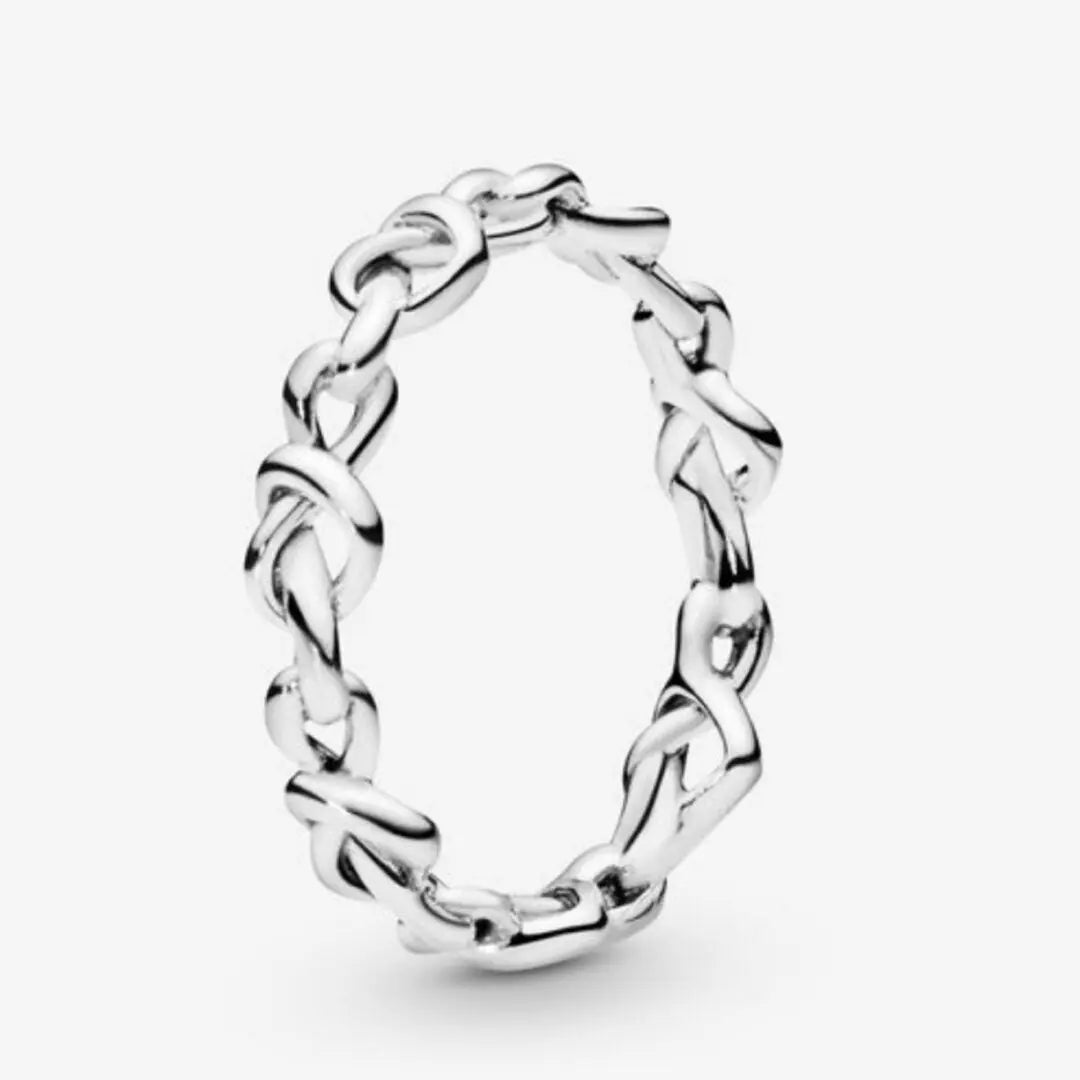 Pandora knotted heart ring represents unbreakable bonds. It is a silver band with interlocking hearts. 198018. Available in size 60 us 9.