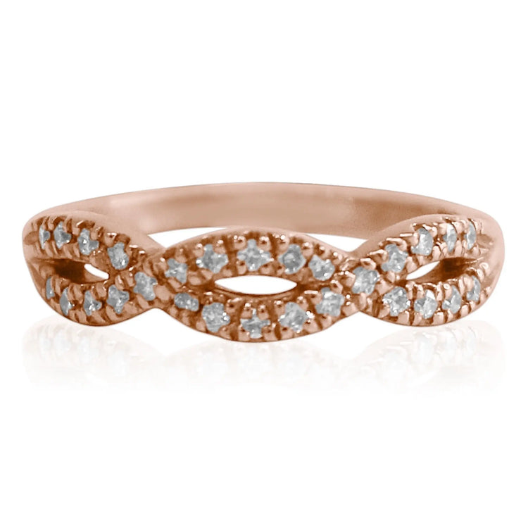 This 14K Rose Gold diamond infinity ring has 28 round brilliant diamonds that light up this piece. The 28 round diamonds weigh 0.28cts and have GH color and VS1 clarity. It is an astounding ring.