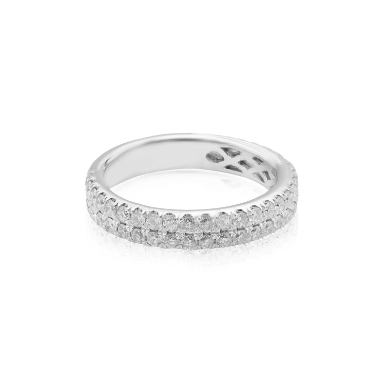 A classic plus one is a beautiful double classic diamond band with breathtaking sparkle. This ring has 60 round diamonds weighing 1.00ct with G color and VS2 clarity in 14K white gold.