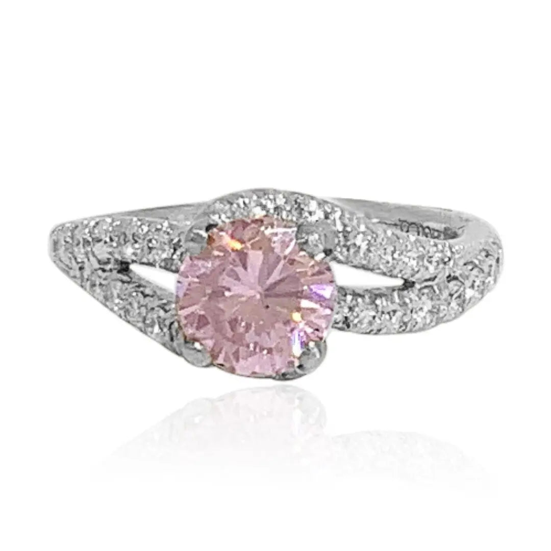 This 14K white gold diamond and pink sapphire ring glitters with a diamond split band that swirls around a stunning pink sapphire. The sapphire is 1.50cts. and the 38 round diamonds are 0.70cts with G color and VS2 clarity.