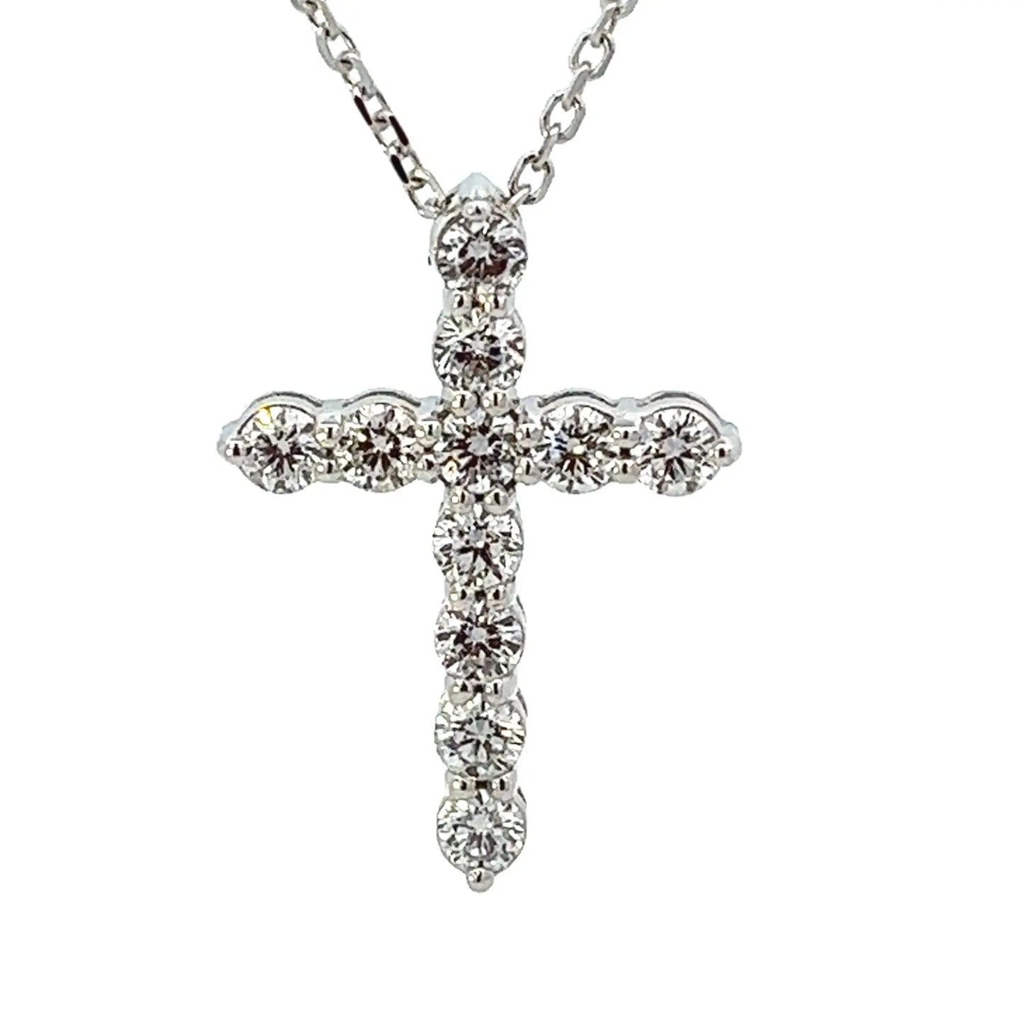 This magnificent 14K white gold diamond cross has 11 gleaming round diamonds that weigh 0.70cts and has F color and VS2 clarity. A stunning piece of jewelry.