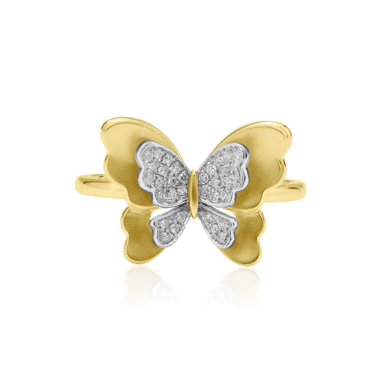 This 14K yellow gold pave butterfly ring is life like in design with a matte gold background and the pave wings in the center. There are 32 round brilliant stones weighing 0.10cts. with G color and VS2 clarity. Let this ring set you free and soar.